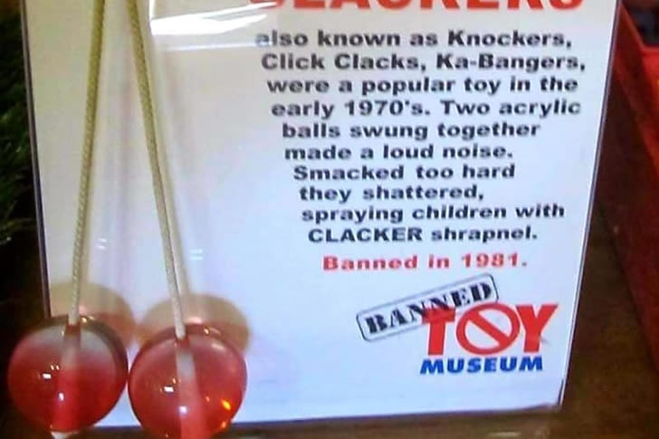 Clackers were simple toys: two hard plastic balls connected by a string, swung to make them “clack” together. But the balls often shattered with enough force to send razor-sharp shards flying, causing eye injuries and cuts.