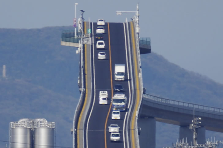 江島大橋は島根県松江市八束町から鳥取県境港市渡町を結ぶ全長1,446.2メートルの橋。思い切りアクセルを踏まないと上れないことから別名「ベタ踏み坂」とも呼ばれています。地上からの視覚角度は45度。真下から見ていると、まるで車が空から落ちてくるよう。しかし、これにはカラクリがあります。