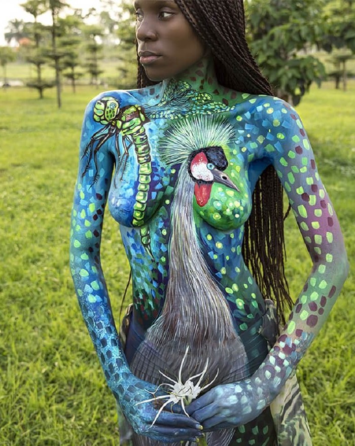 Diese Körperkunst vereint zwei faszinierende Lebewesen: Eine präzise gemalte Libelle mit schimmernden Flügeln und ein Graukronenkranich, der als Nationalvogel Ugandas gilt. Die Libelle, bekannt für ihre agilen Flugmanöver, steht in der japanischen Kultur für Mut und Wiedergeburt – in China und Japan wird sie auch für medizinische Anwendungen genutzt, obwohl dies in der westlichen Welt umstritten ist.