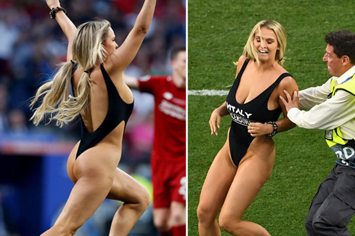 Sportereignisse ziehen immer wilde Aktionen nach sich: spektakuläre Kostüme, riesige Plakate – Fans lassen sich ausleben. Aber Grenzen gibt es auch hier. Die Dame auf dem Bild überschritt sie scheinbar spontan: Nur in einem winzigen Badeanzug stürmte sie auf das Spielfeld.