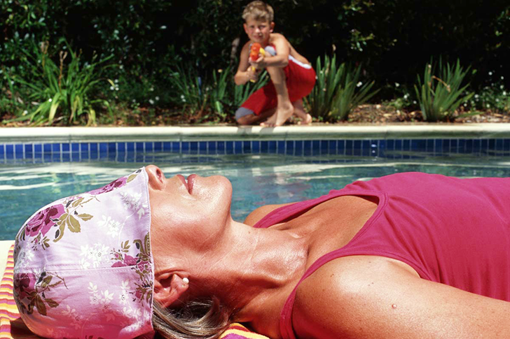 Wenn ein Kind voll mit einer Wasserpistole bewaffnet ist, ist kein Schwimmer sicher. Diese Dame mag denkt, sie genießt ihren Tag, genießt die Sonne und muss sich um nichts auf der Welt kümmern. Aber es sieht so aus, als wäre ihr eine unhöfliche (und nasse) Überraschung bevorstehend. Hoffentlich ist dieses Kind nicht besonders zielsicher!