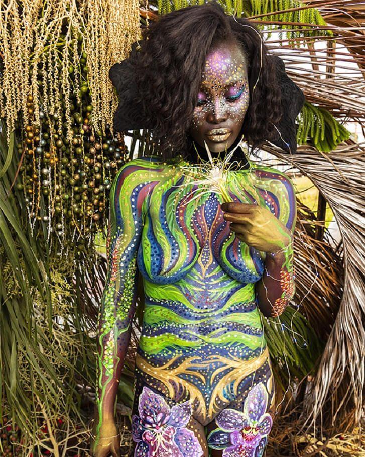 Mit diesem aufwändigen und farbenfrohen Ganzkörperkunstwerk könnte diese Frau glatt einer Waldfee entsprungen sein. Ihr Look könnte nahtlos in einen Fantasy-Film passen, möglicherweise sogar in die Kulisse von Narnia. Feen und Elfen werden in verschiedenen Kulturen unterschiedlich interpretiert. Sie gelten oft als wunderschöne Wesen, die das Leben und den Planeten schützen. Sie sind sogar als Zahnfeen bekannt, die Kindern Geld für ihre ausgefallenen Milchzähne hinterlassen.