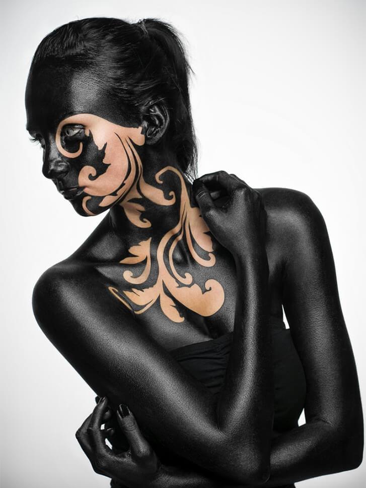 Es scheint, als wäre diese Frau zunächst vollständig in Schwarz gemalt worden, und das Muster wurde geschaffen, indem die Farbe von ihrer Haut entfernt wurde, um ihren natürlichen Teint durchscheinen zu lassen. Ihr natürlicher beiger Hautton bildet einen Kontrast zur schwarzen Farbe.