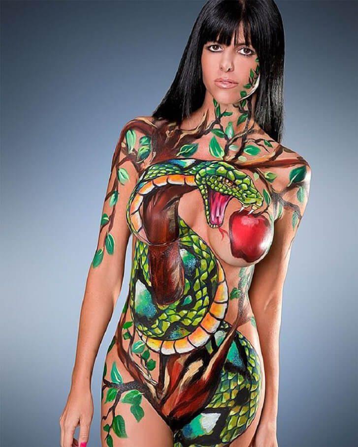 In biblischen Erzählungen kostete Eva die verbotene Frucht, verführt von Satan in Gestalt einer Schlange, dazu verleitet. Dies führte zur Vertreibung von Eva und Adam aus dem Paradies. Dieses Gemälde stellt die Szene dar, in der eine Schlange über den Körper und die Beine der Frau verläuft, während sie nach dem Apfel auf ihrer Brust greift.