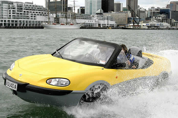 Sieht aus wie aus einem Actionfilm, ist aber Realität: In Dubai gibt es Autos, die sowohl auf Land als auch auf Wasser fahren können. Sie sehen sportlich aus und verwandeln sich in Sekunden von einem Geländewagen in ein Wasserfahrzeug.