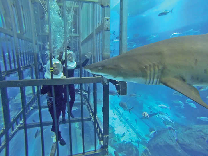 Neben der gigantischen Dubai Mall befindet sich ein riesiges Aquarium, das mehr an einen Dschungel als an ein Einkaufszentrum erinnert. Hier leben unter anderem Krokodile, Quallen und Piranhas – eine Unterwasserwelt zum Staunen. Für besonders Mutige gibt es sogar die Möglichkeit, Haien ganz nah zu kommen – natürlich in einem sicheren Käfig.