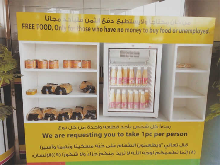 Trotz all des Reichtums gibt es in Dubai auch soziale Hilfsprojekte. Das „Ansar“-Einkaufszentrum bietet kostenlose Lebensmittel für Bedürftige an – einfach zugänglich in einem speziellen Regal. Hier kann man sich nehmen, was man braucht, ohne Fragen oder Bürokratie.