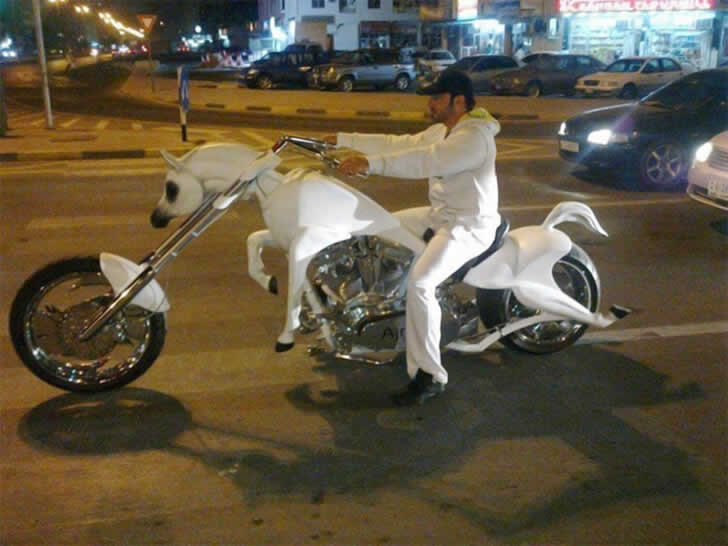 In Dubai ist es nichts Ungewöhnliches, Fahrzeuge in wahre Kunstwerke zu verwandeln – ob mit Gold überzogen oder auf die doppelte Größe erweitert. Ein ganz besonderer Fall ist ein Motorrad in Pferdeform, das einem arabischen Vollbluthengst nachempfunden wurde. Der stolze Besitzer trägt dazu sogar ein Reitoutfit – ganz im Stil der Wüste.