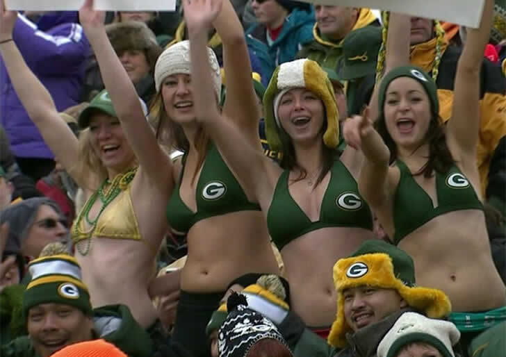 Diese weiblichen Packers-Fans feuern ihr Team in Bikini-Outfits mit voller Begeisterung an – Hände in die Luft, Stimmung auf dem Höhepunkt! Die Green Bay Packers aus Wisconsin gehören zu den erfolgreichsten NFL-Teams mit stolzen 13 Meistertiteln.