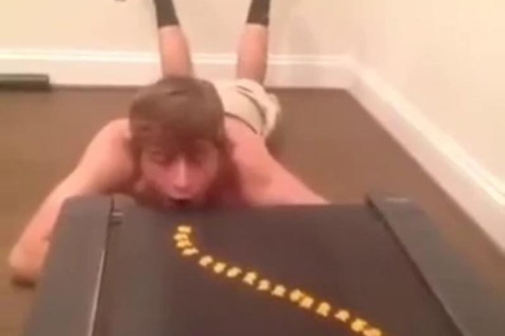 Ein klassischer Fall von “zu wenig Pre-Workout-Nahrung”! Dabei gibt es doch so viele schonendere Alternativen zum Laufband – vom Ergometer bis zur Hantelbank. Aber wer so hungrig ist, nimmt wohl, was gerade verfügbar ist. Vielleicht sollte das Studio künftig Snack-Stationen zwischen den Geräten installieren…