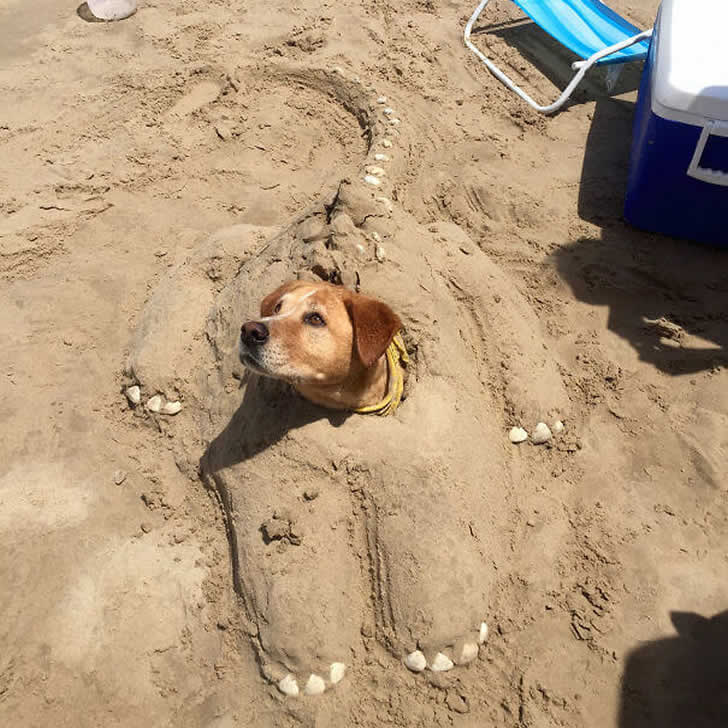 Dieser brave Hund verdient eine Medaille für Geduld. Eingebuddelt im Sand, nur der Kopf schaut raus – der Rest seines Körpers wurde kunstvoll in einen Dinosaurier verwandelt.