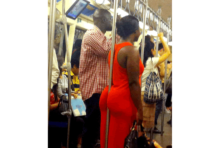 Nun, liebe Freunde, hier haben wir ein Paradebeispiel für moderne Kunst im Alltag! Unsere schicke Dame in Rot hat eine besondere Beziehung zur U-Bahn-Stange entwickelt. Ist es Liebe auf den ersten Sitz? Oder vielleicht nur ein zufälliges Treffen?