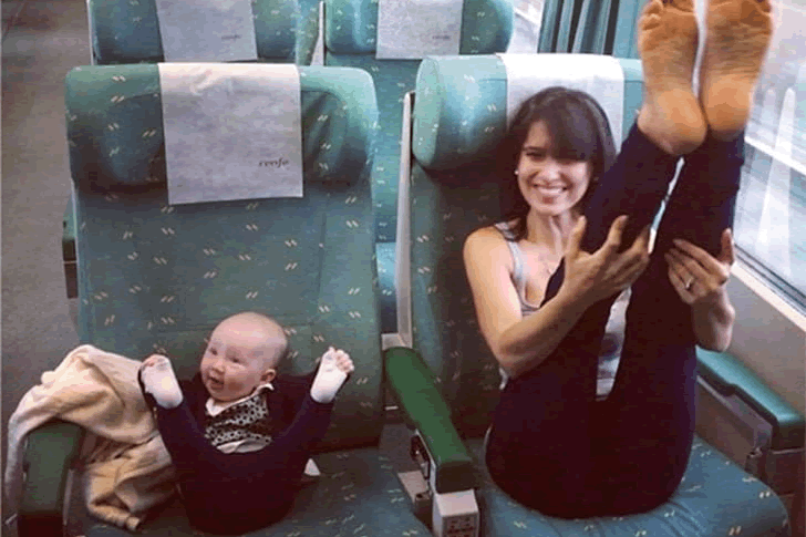 Die hier gezeigte Pose heißt Ananda Balasana, auch bekannt als “Fröhliches Baby”. Dieser Pose wird oft bei Babys angewendet, da sie Sanftheit und Ruhe betont. Und wie alle körperlichen Aktivitäten verbessert sie den Geist und Körper. Was für eine herrliche Art, trotz Stoßzeit Qualitätszeit zu verbringen!