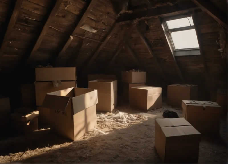 John climbed up and slowly searched the attic. Dusty boxes lined the space, casting eerie shapes under the flashlight’s beam.