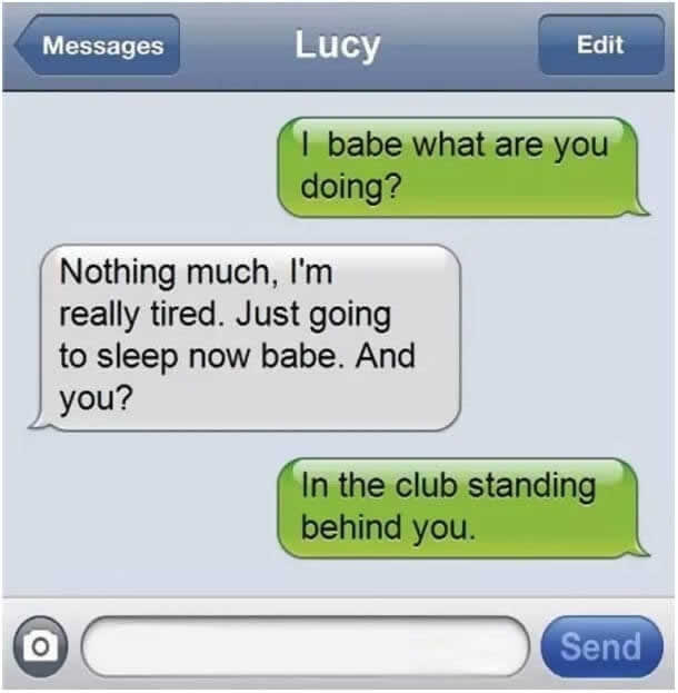 Una chica compartió una captura de pantalla de una conversación de texto donde su novio afirmaba que “ya se iba a la cama”. Poco sabía él que ella estaba de pie directamente detrás de él en la misma discoteca, y tenía las fotos para demostrar que su “hora de dormir” era en realidad una noche en la pista de baile.