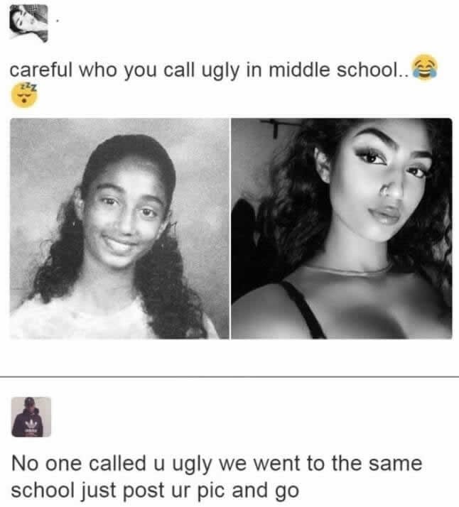 O bullying é um problema sério, mas usá-lo como uma história de fundo fabricada para obter simpatia é um novo nível de baixeza. Esta rapariga partilhou uma publicação de “transformação”, comparando uma foto do ensino fundamental com uma recente, com uma legenda sobre como as pessoas costumavam chamá-la de feia.