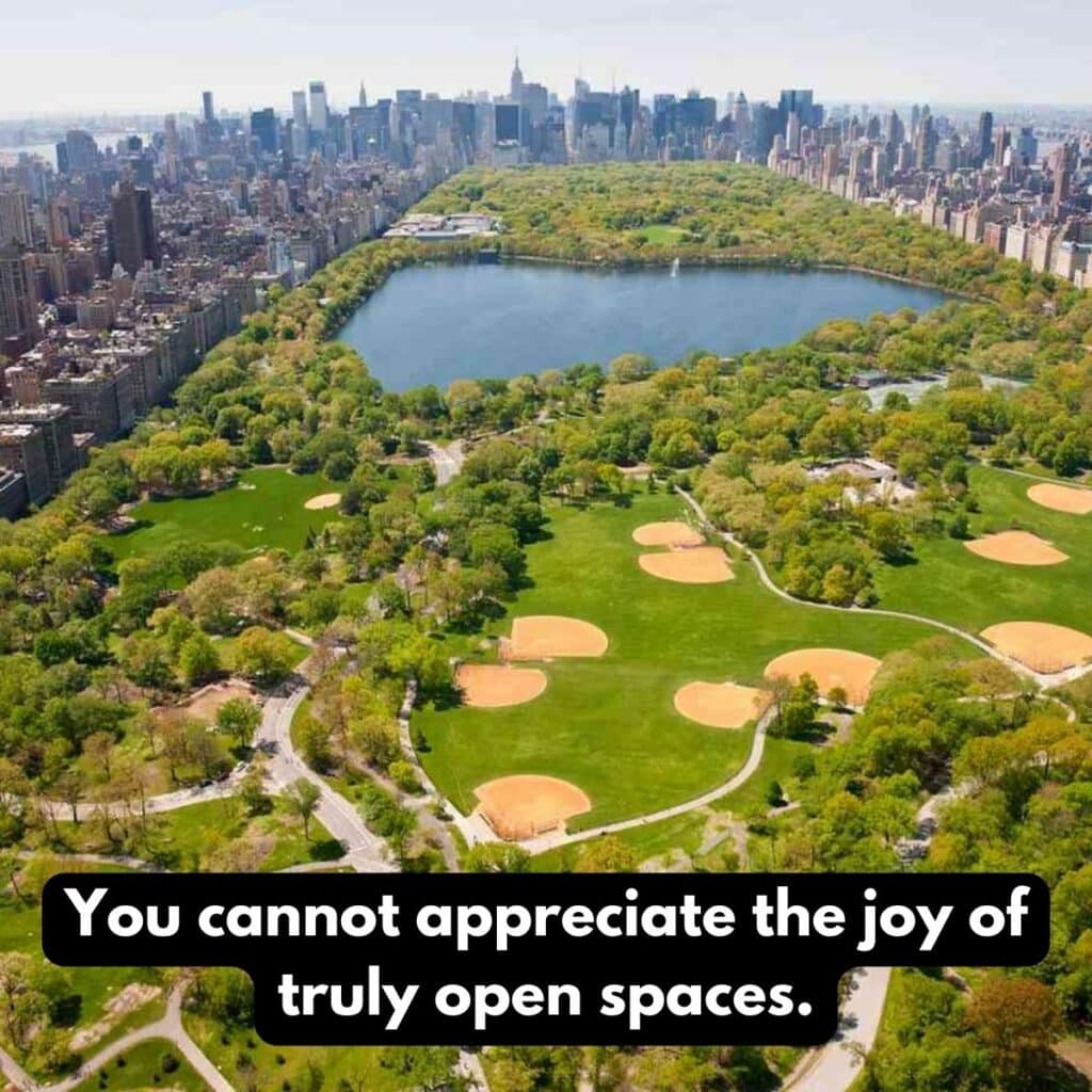 Se há algo que temos de sobra nos EUA, são espaços abertos. Quero dizer, você já viu as Grandes Planícies? Elas não são chamadas de “grandes” à toa! E nem me fale dos nossos parques nacionais – Yosemite, Yellowstone e o Grand Canyon.Temos hectares e hectares de espaços abertos para nos perdermos…