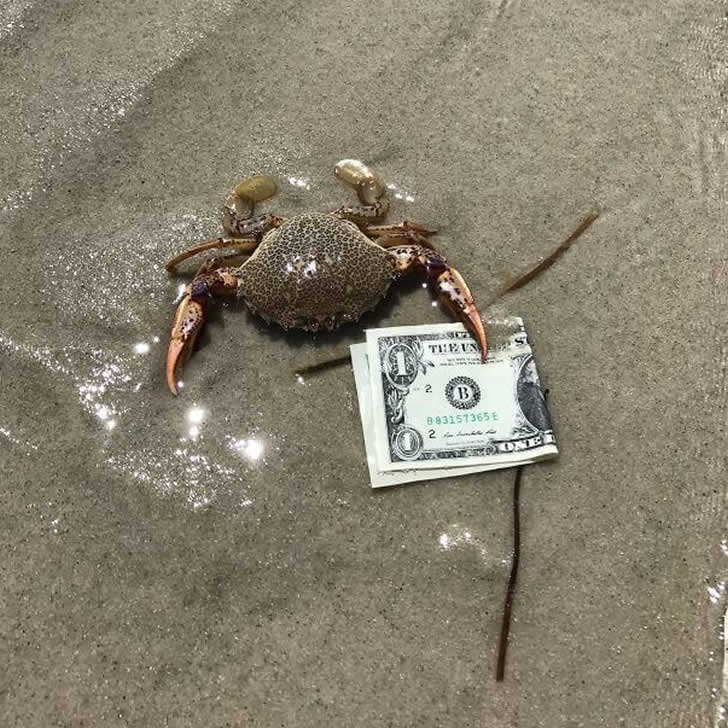 Un crabe tient une liasse de billets — ou du moins, quelque chose qui y ressemble — et toute la scène ressemble à une transaction louche sur le sable. Il tente de soudoyer un maître-nageur ? D’acheter son retour dans l’océan ?