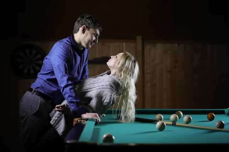Dans un bar éclairé au néon, un couple s’est penché sur une table de billard pour une photo coquine, visages à quelques centimètres l’un de l’autre, yeux dans les yeux, mains entrelacées. Des amis les entouraient, téléphones à l’affût, musique pulsante, créant une scène d’intimité et d’élégance. Le tapis vert brillait sous les lumières, ajoutant une touche cinématographique à la composition romantique.
