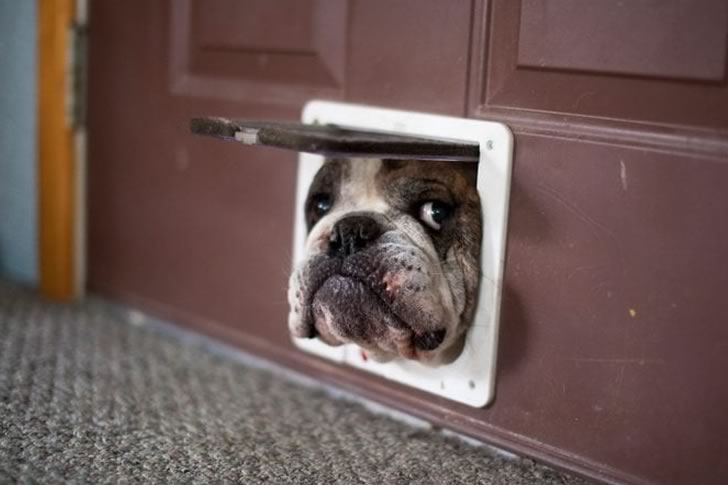 This picture is a hilarious reminder of pets’ curious nature and their sometimes awkward adventures. The bulldog’s earnest look through the flap can turn any frown upside down, making it a perfect pick-me-up. It’s a lighthearted moment that celebrates pet antics.
