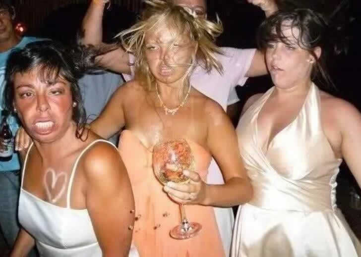 These wedding guests clearly had the time of their lives—and it shows. With makeup smudged and expressions that scream “too many cocktails,” this snapshot captures the moment where good times crossed into full-blown chaos. Whatever happened, they embraced it with zero regrets.