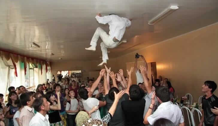 We don’t know how this guy ended up headfirst through the ceiling, but the look of concern on everyone’s faces says it wasn’t planned. If that’s the groom, he may have just turned his wedding into a trip to the ER.