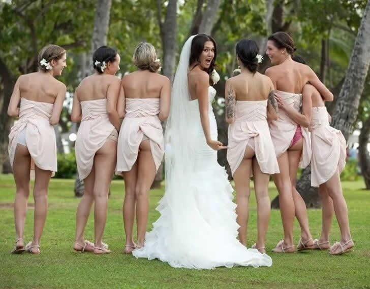 This pose is bold, bizarre, and definitely not your typical bridal party photo. The bridesmaids went all in, whether it was the bride’s idea or just a moment of shared hilarity. Either way, it’s hard to look at this without raising an eyebrow—and maybe stifling a laugh.