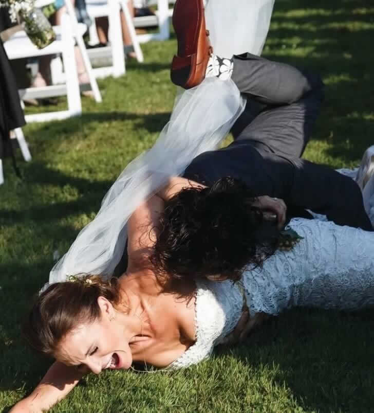 At first glance, this looks like post-wedding football. But look closer—you’ll see this happened mid-ceremony. Someone took a spill, and the bride ended up on the ground, probably wondering how she went from “I do” to “ouch” in under a second.