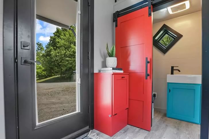 At the far end of the hallway is a bathroom that blends charm with practicality. One of its most eye-catching features is a diamond-shaped window that lets in natural light while adding a creative touch. A composting toilet and roomy glass-enclosed shower make it both eco-friendly and user-friendly.
