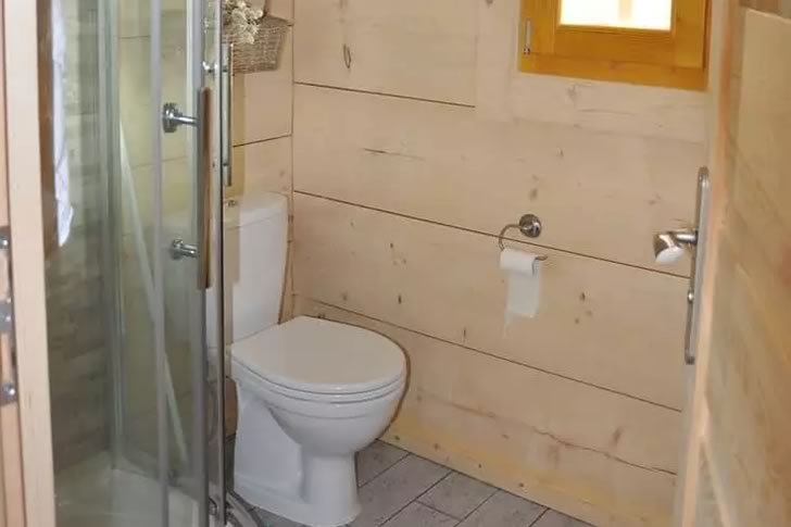 Despite its limited space, this cabin features a fully equipped bathroom that covers all the essentials. It includes a shower, a toilet, and a small window for natural ventilation, maintaining a clean and fresh environment. Its layout is smart, maximizing function without feeling cramped.