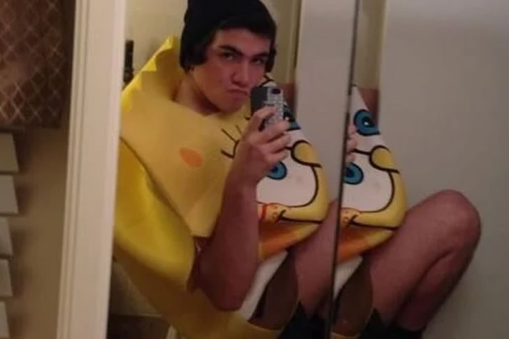 In a world where creativity meets chaos, this selfie truly pushes the limits. The young man, dressed head-to-toe in a SpongeBob costume, is crammed into what appears to be a bathroom cabinet or an extremely tight corner beside a mirror. His determined pout and exaggerated pose only add to the surreal quality of the image. It’s not just a selfie—it’s a performance, capturing the absurdity of trying to stand out on the internet by doing something outrageously memorable.