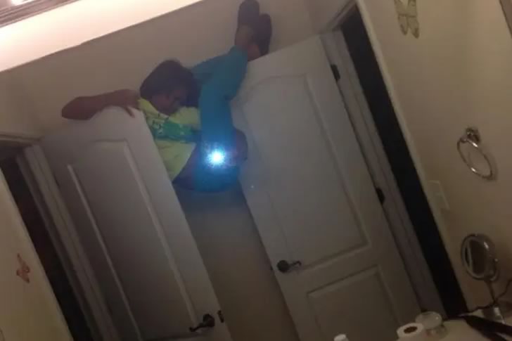This image captures a jaw-dropping moment where someone has taken a selfie to an extreme level by positioning themselves upside down between two open doors. With their feet resting on the top frame and body hanging precariously, the person adds a glowing light effect, creating a surreal and thrilling visual. The bathroom setting, complete with a towel rack and mirror, adds an everyday contrast to the wild acrobatics, making it a standout in the collection of daring selfies.