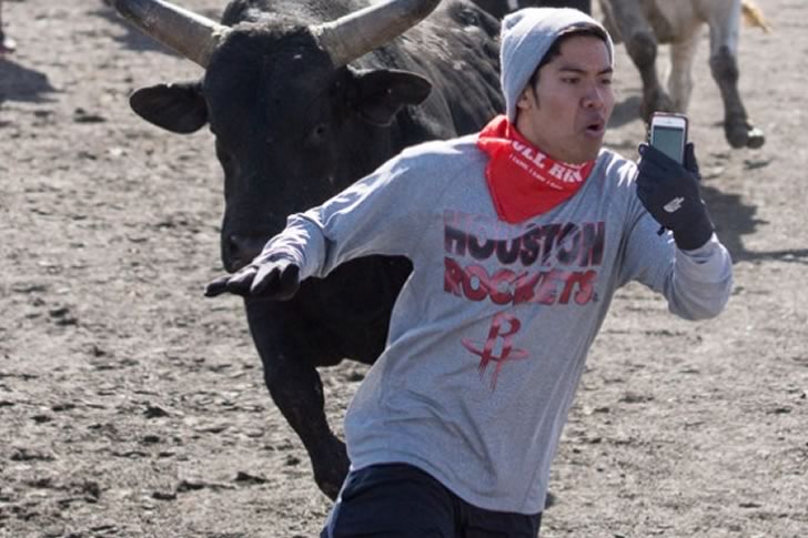 This image captures an exhilarating moment where a man takes an extreme selfie while being chased by a bull during a chaotic run. Wearing a Houston Rockets shirt and a red bandana, he holds his phone steady, with the bull’s horns dangerously close behind him. The dusty arena and crowd of runners add to the intense atmosphere, making this a thrilling example of daring photography.