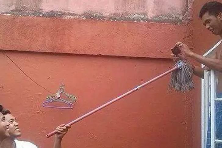 This scene captures the wild creativity of pushing selfie boundaries, blending everyday chores with daring photography. The improvised setup with the mop and the window perch shows their adventurous spirit, creating a laugh-out-loud image that stands out for its unusual approach. It’s a perfect example of how far people will go for an extreme and memorable shot.