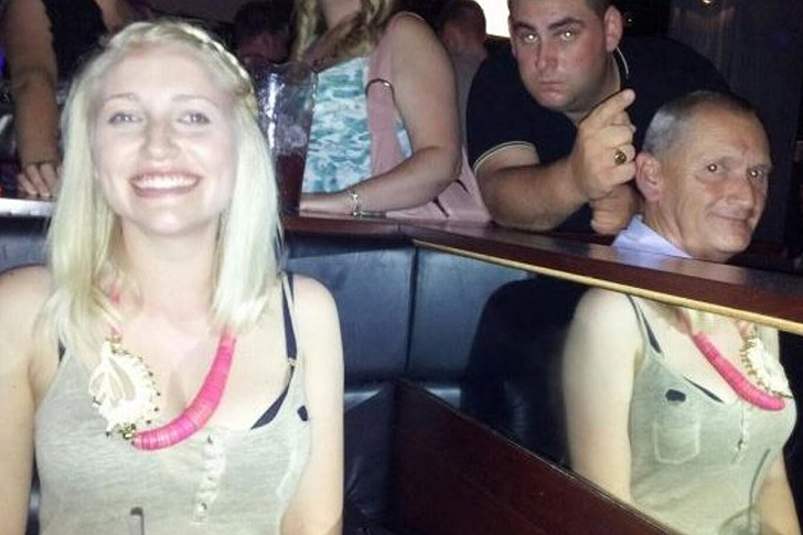 왼쪽에 있는 여인이 이 앙상블을 선택했을 때, 그녀는 자신이 가장 기묘한 셀카 실패 중 하나를 저지르게 될 것이라고는 상상도 못했을 것입니다. 그런데 동시에 이것은 엄청난 성공이었습니다. 그녀는 의도치 않은 시각적 트릭을 특수한 거울 부스 덕분에 얻게 되었습니다.