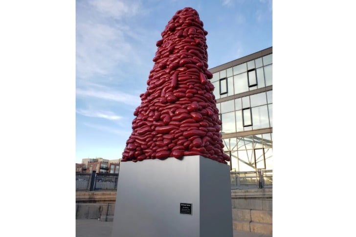 Che ne dite di “National Velvet” dell’artista John McEnroe, Denver, CO? Tutti conoscono e parlano di Blucifer, il nostro bronco infernale, ma tutti dimenticano questa scultura che sembra un mucchio di calze piene di cemento e dipinte di rosso. A me sembra sempre un mucchio di reni umani.