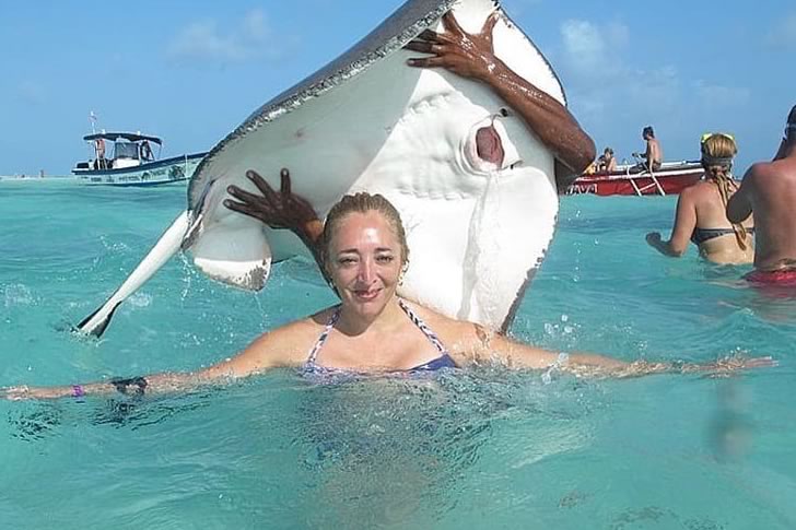 彼女は、アカエイの家具として選ばれたことが休暇のハイライトであるかのように、大喜びしているように見えます。一方、背景にいる他の人々は、家でストーブを消し忘れたことを急に思い出して、ゆっくりと後ずさりしています。スティーブ・アーウィンはどこかで墓の中で寝返りを打ちながらも、同時に拍手していることでしょう。