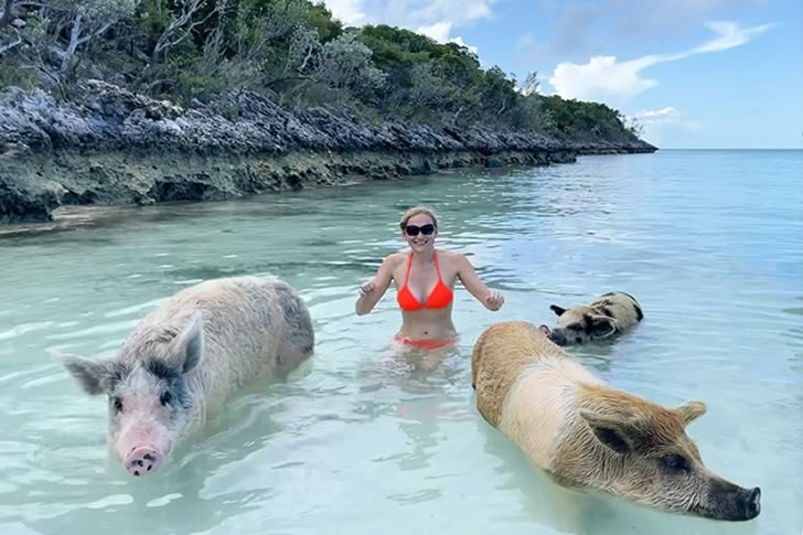 これはディズニー映画の始まりか、それとも史上最も奇妙なバチェロレッテパーティーのどちらかだろう。ブタたちは明らかに最高の人生を送っており、彼女が日焼け止めと自信だけでバハマを征服したかのようにポーズを取っている間も、のんびりと浮かんでいる。