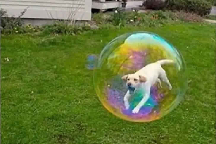庭で撮影されたこの写真は、思わず二度見してしまう完璧なタイミングが魅力です。大きなシャボン玉の中に、楽しそうに走る犬が閉じ込められた瞬間が捉えられています。虹色に輝くシャボン玉と、元気いっぱいの犬の姿が絶妙に重なり、まるで夢のようなシーンが生まれました。緑の芝生と背景の家が穏やかな雰囲気を演出する中、この一瞬がユーモアと驚きを添えてくれます。こんな偶然のタイミングが、日常の遊び時間を特別なものに変えるなんて、驚くばかりです。