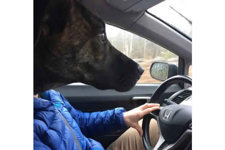 車内で撮影されたこの写真は、思わず二度見してしまう完璧なタイミングが印象的です。運転席に座る人がハンドルを握る中、隣から犬の顔が大きく覗き込み、まるで犬が車を運転しているかのような瞬間が捉えられています。犬の真剣な表情と人間の手が絶妙に重なり、ユーモラスな錯覚が生まれました。車窓から見える木々と曇った空が、日常的なドライブの風景を一瞬にして驚きのシーンに変えます。この偶然のタイミングが、普通の移動時間を特別なものに変える魔法のような一枚です。