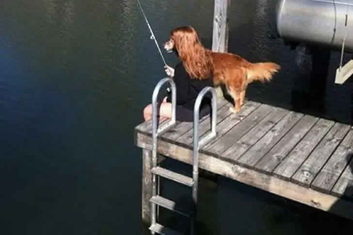 桟橋で撮影されたこの写真は、思わず二度見してしまう完璧なタイミングが印象的です。女性が釣り竿を持って座る中、隣に立つ犬の顔が彼女の頭とぴったり重なり、まるで犬が釣りをしているかのような瞬間が捉えられています。穏やかな水面と木製の桟橋がのどかな雰囲気を演出する中、犬の真剣な表情と釣り竿が織りなすユーモラスな錯覚が、驚きと笑いを誘います。この偶然のタイミングが、静かな釣りの時間を特別なものに変える魔法のような一枚です。