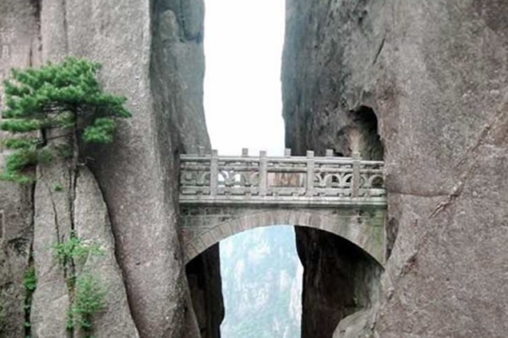 黄山と呼ばれる中国東部の山脈には、不滅の橋と呼ばれる象徴的なメガネ橋がかかっています。世界で最も高い橋と呼ばれることもあり、高所恐怖症でなくても下を見るのは勇気がいるでしょう。確かなのは橋が石でできているため、橋自体が落ちることは考えられないことだけです。ちなみに不滅の橋と呼ばれているのは、永久不滅の橋を願ってのこと。