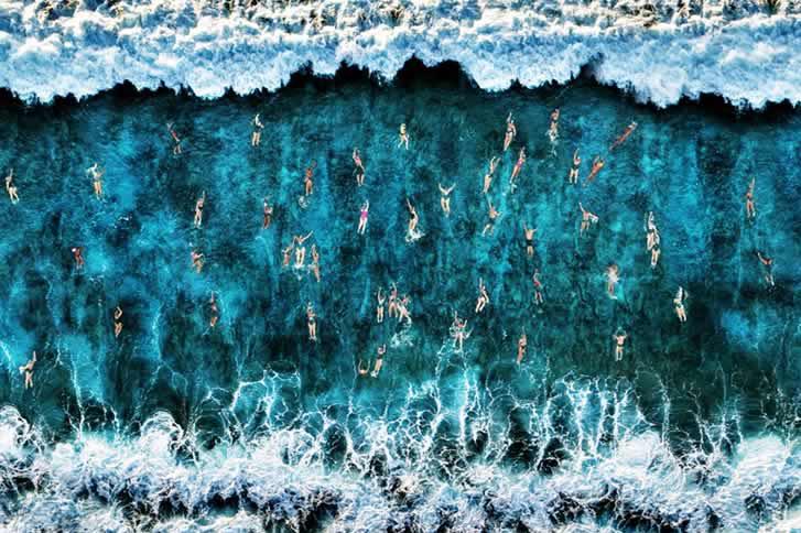 この写真は、海とそこで泳ぐ人々の美しい姿を一枚に収めています。波の中を泳ぐ彼らの姿が、まるで海と一体となっているかのように見えます。この写真は、写真家が技術を磨き続けてきた成果として称賛されるべき作品です。