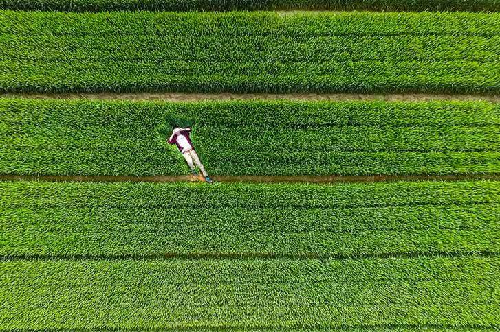 下の写真は、草むらの中で横になって休んでいる男性です。彼は気絶しているのかもしれませんが、手で目を覆っていることから、ただ作業に疲れて休んでいるだけのようです。ただし、脱水症状や日焼けを避けるために、早めに日陰を見つけた方が良いでしょう。