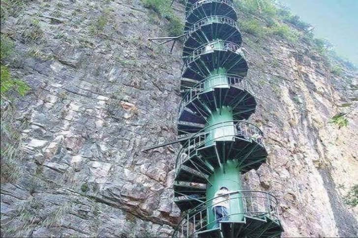 中国の太行山(タイハンシャン)は、興味深い建築物の中でも最も印象的かつ衝撃的なものの一つと言っても過言ではないでしょう。なぜ山の中腹にこんなおかしな建築物を建てるのか、確かに非常に合理的な説明がある(そうであってほしい)のでしょうが、この階段を見てしまうと合理的な言い訳を思いつくは困難です。高さ約90メートルもあるこの螺旋階段は、山の頂上までの疲れる旅に出る勇気ある人を待っています。