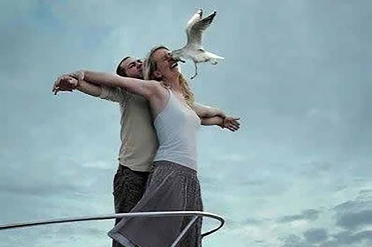 Hanno cercato di copiare una posa iconica, sperando di ottenere una foto fantastica. Sfortunatamente, è stato solo l’uccello a spiccare il volo. Ad essere sinceri, in questa situazione stiamo dalla parte dell’uccello. Non ci sono molte cose più divertenti degli animali che rovinano i piani umani. Inoltre, Titanic esiste da decenni; forse è ora di scegliere un film diverso da imitare!