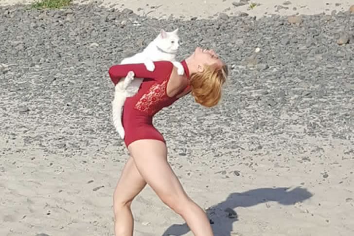 Se possedete un gatto, saprete che i felini hanno una strana fascinazione per la sabbia. Dopotutto, è praticamente la loro lettiera naturale. Ma in questa foto, la sabbia incontra l’eleganza. Una ballerina assume una posa splendidamente composta sulla spiaggia, ma tutti gli occhi sono puntati su Buns, il gatto glorioso e curioso che ruba la scena.
