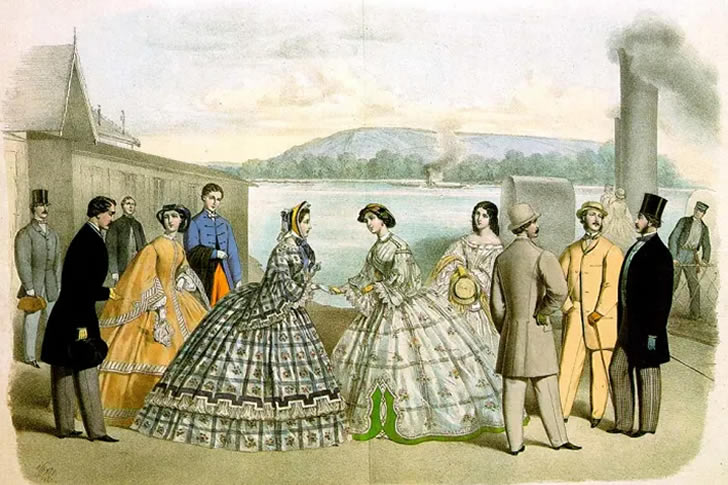 The hoop skirt was a large undergarment worn under dresses to hold skirts in a wide, bell-like shape. It kept fabric away from the legs during hot weather and was even practical for women working outdoors. Over time, what began as a useful garment became a dramatic fashion statement, with skirts growing wider and more ornate. The skirt’s exaggerated width symbolized wealth and high status among the upper classes.