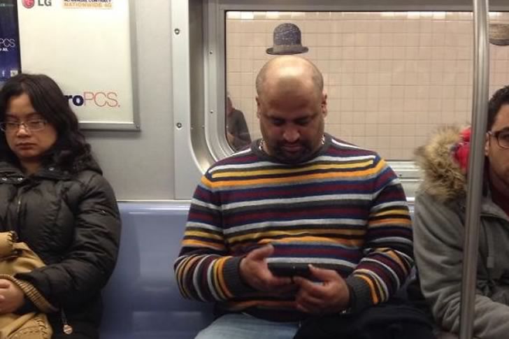 Everyday commutes rarely deliver moments of visual wonder, but sometimes, all it takes is the perfect angle to transform the mundane into the magical. In this photo, a man sits quietly on a subway, deeply absorbed in his device. Yet above him, seemingly levitating atop his head, is a perfectly aligned hat—actually part of an ad or artwork outside the train window. The illusion is so precise, it tricks the eye into believing the man is sporting a quirky, old-fashioned bowler.