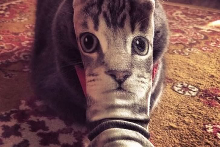 At first glance, this image might confuse the viewer—are we looking at a cat or a surreal cartoon? In reality, it’s a perfectly timed photo capturing a real cat whose face is momentarily replaced by a sock printed with a feline portrait. The alignment is so flawless that the sock’s face seamlessly blends with the cat’s ears and fur, creating an amusing and slightly eerie illusion. It’s a rare example of real-life mimicry captured without any digital trickery.